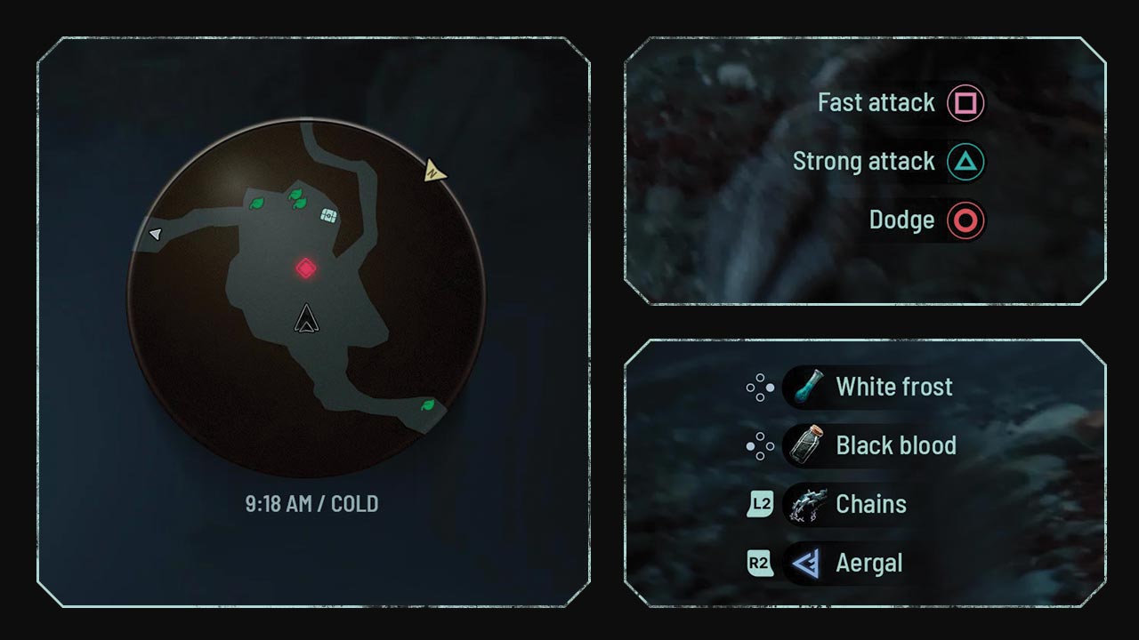 The items displayed in the bottom left corner follow a layout similar to The Witcher 3, maintaining a sense of continuity. However, I added gamepad input indicators to support players — particularly returning fans who may be playing mainly for the story and taking longer breaks between sessions.